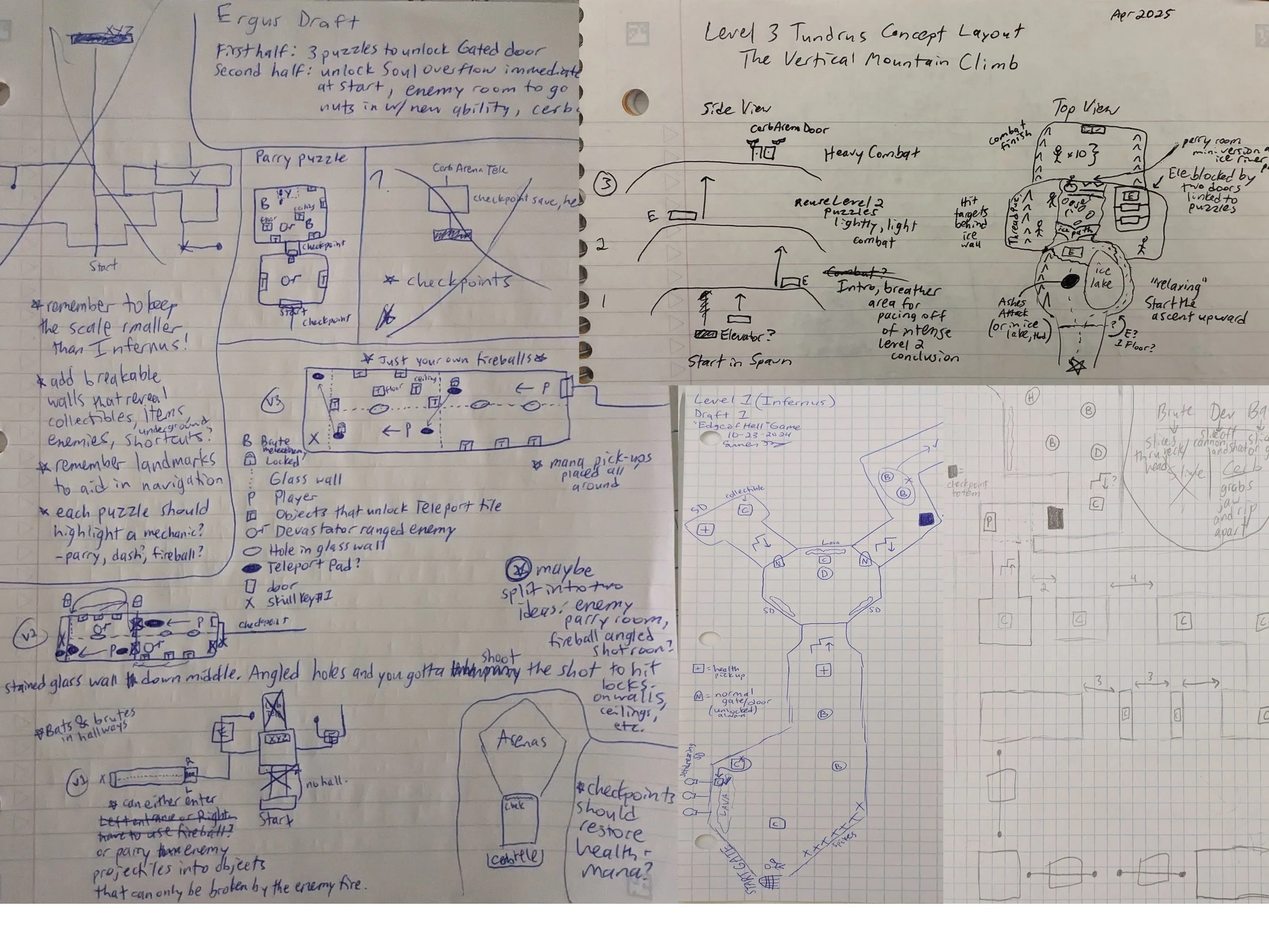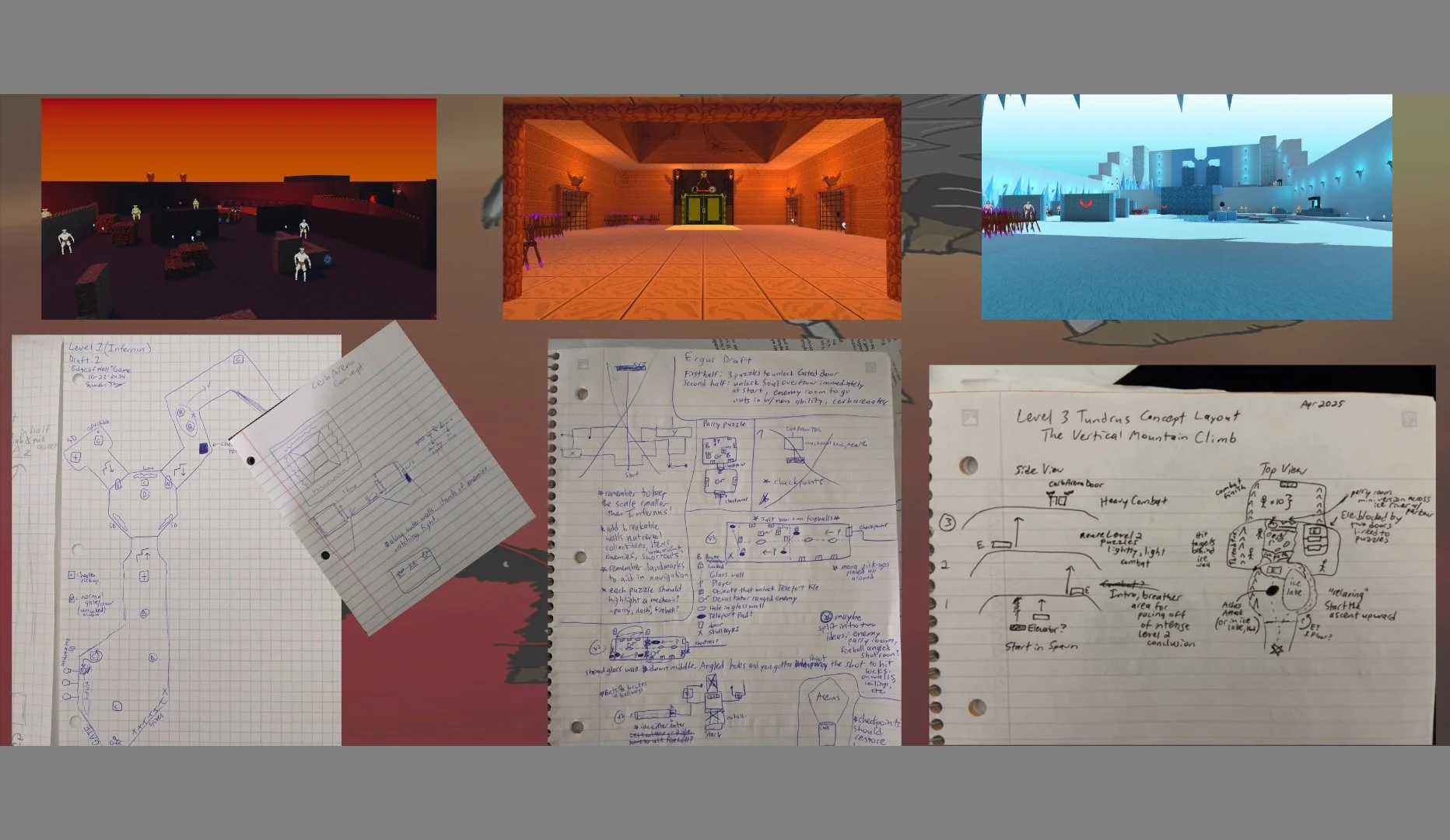 One thing that I initially struggled with during development was over-committing to translating my paper designs to my blockouts in a 1:1 fashion. I learned that the key to good level design, and by extension all game design, is to iterate and improve upon your ideas until they feel right. Changes can take place all throughout the process. Even as early as game mechanics being tested in the independent “Gym” level I created, where everyone on the team could experiment with level ingredients, enemy encounters, etc. Initial drafts are great for locking in a certain vibe or general layout of the level, and blockouts are great for fine-tuning how the level plays in the actual game. However, it takes time to work through those processes through many essential stages of iteration that stack on top of each other like Legos. The final product rarely looks exactly 1:1 to the initial idea, and I learned that this is actually a very good thing because it means the idea was improved and iterated on for the benefit of all. The process of design is an iterative and collaborative experience that I wholeheartedly enjoy.