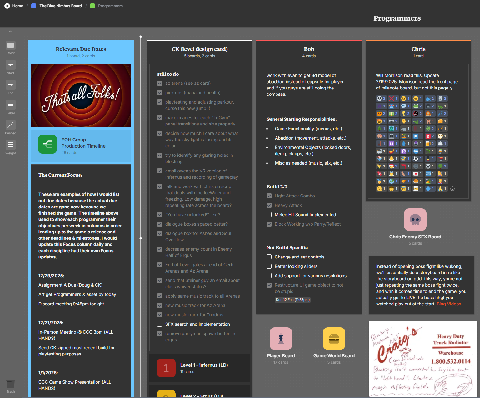 Since this game was subject to various deadlines to meet for in exchange for grades, I as project lead had to keep everyone, including myself, incredibly organized throughout the entire development cycle. I created a master google drive folder with dozens of subfolders designed to keep everyone’s assets organized for easy access. I wrote up our copious amounts of documents, including but not limited to: the GDD, meeting notes, development plans, schedules, timelines, work distributions, to-do lists, asset requests, narrative beats, QA logs, content ideas, and outlines. All of my efforts in the managerial department were to keep the team on the same page regarding EOH’s overarching vision & goals. I made sure the boring, yet essential, background work got done so that the creatives on my team could focus 100% on the task in front of them.