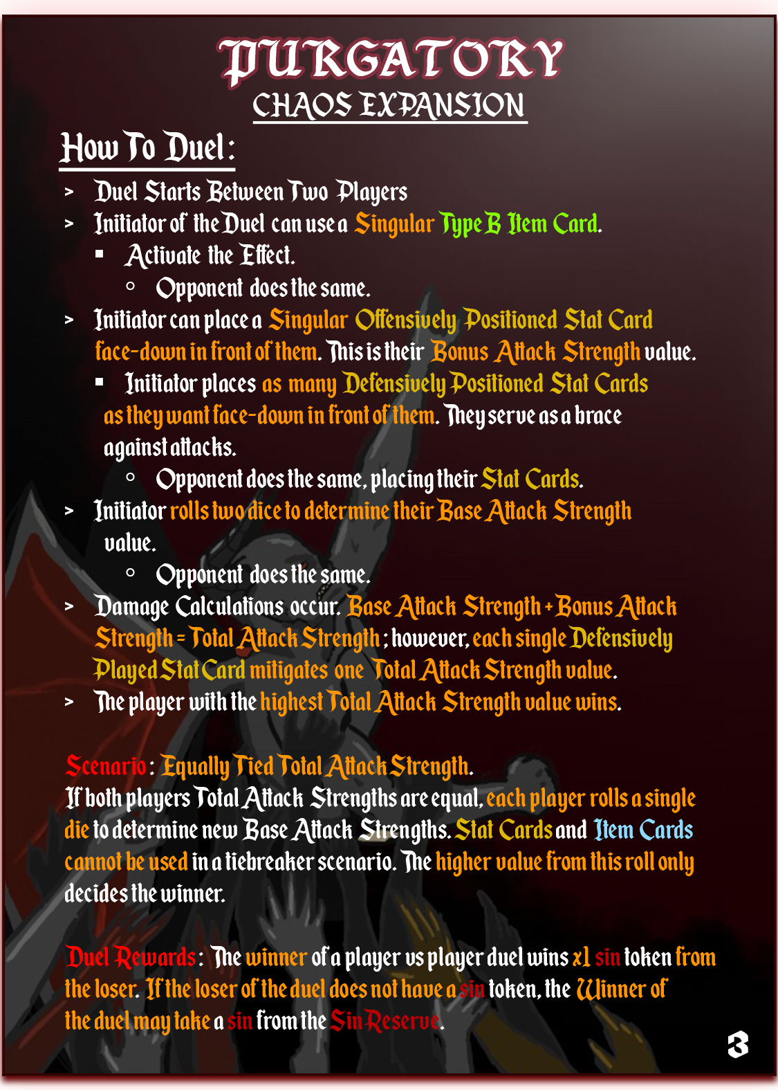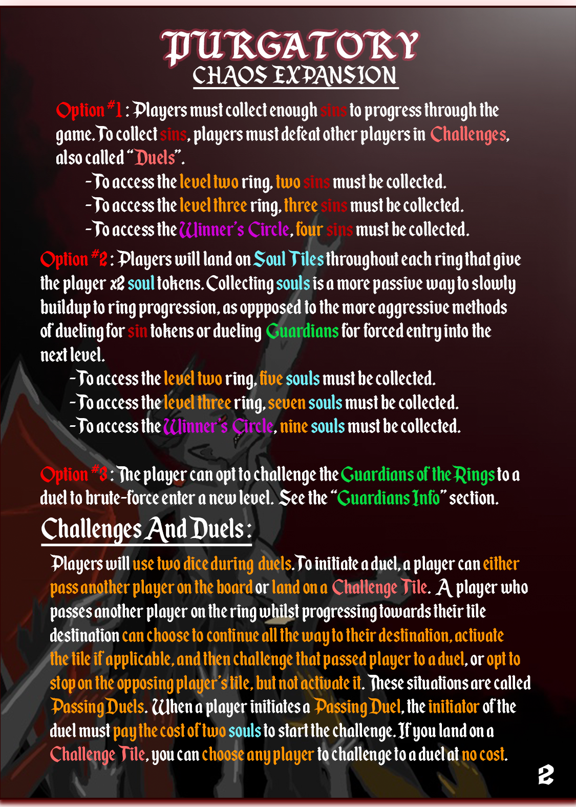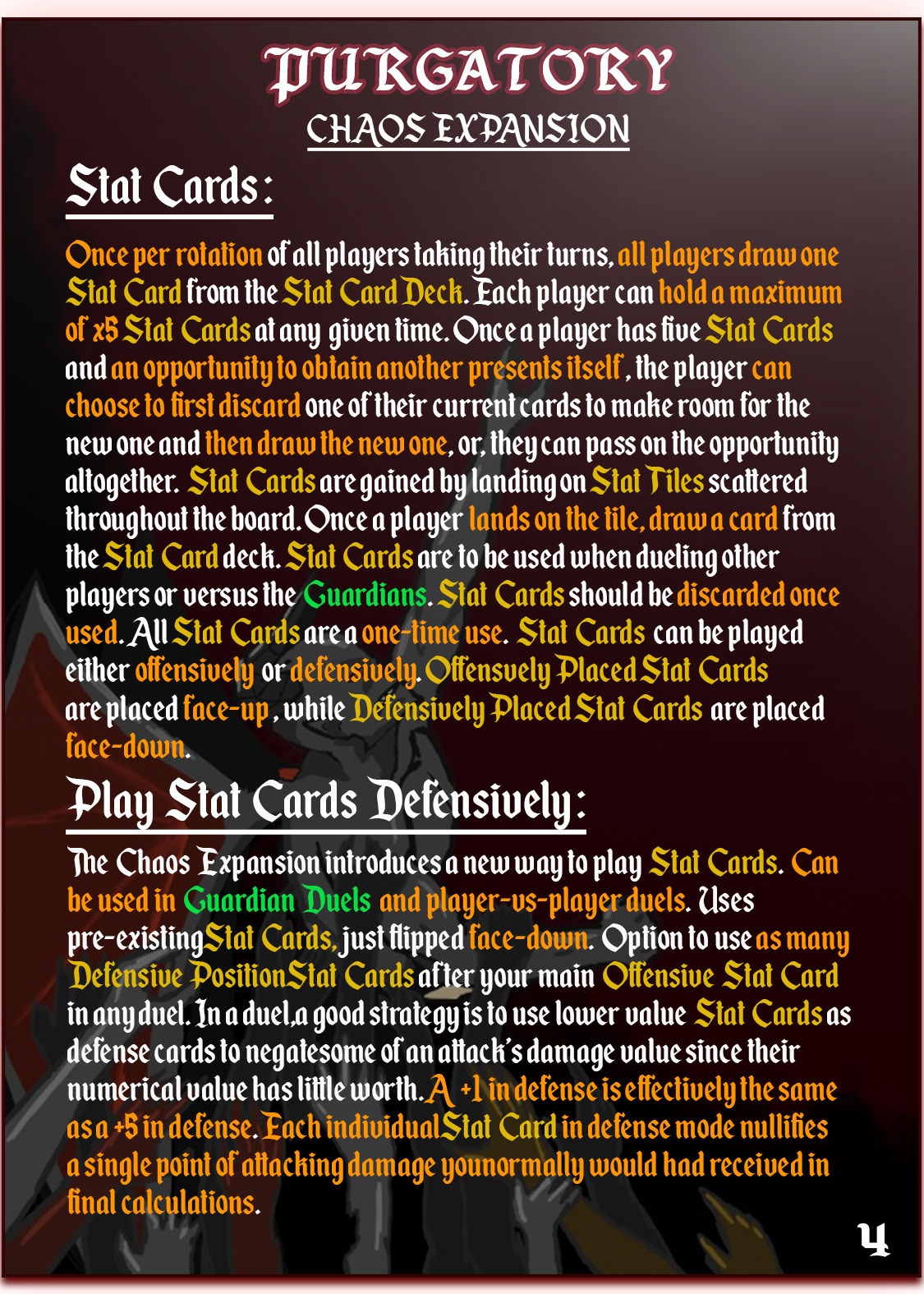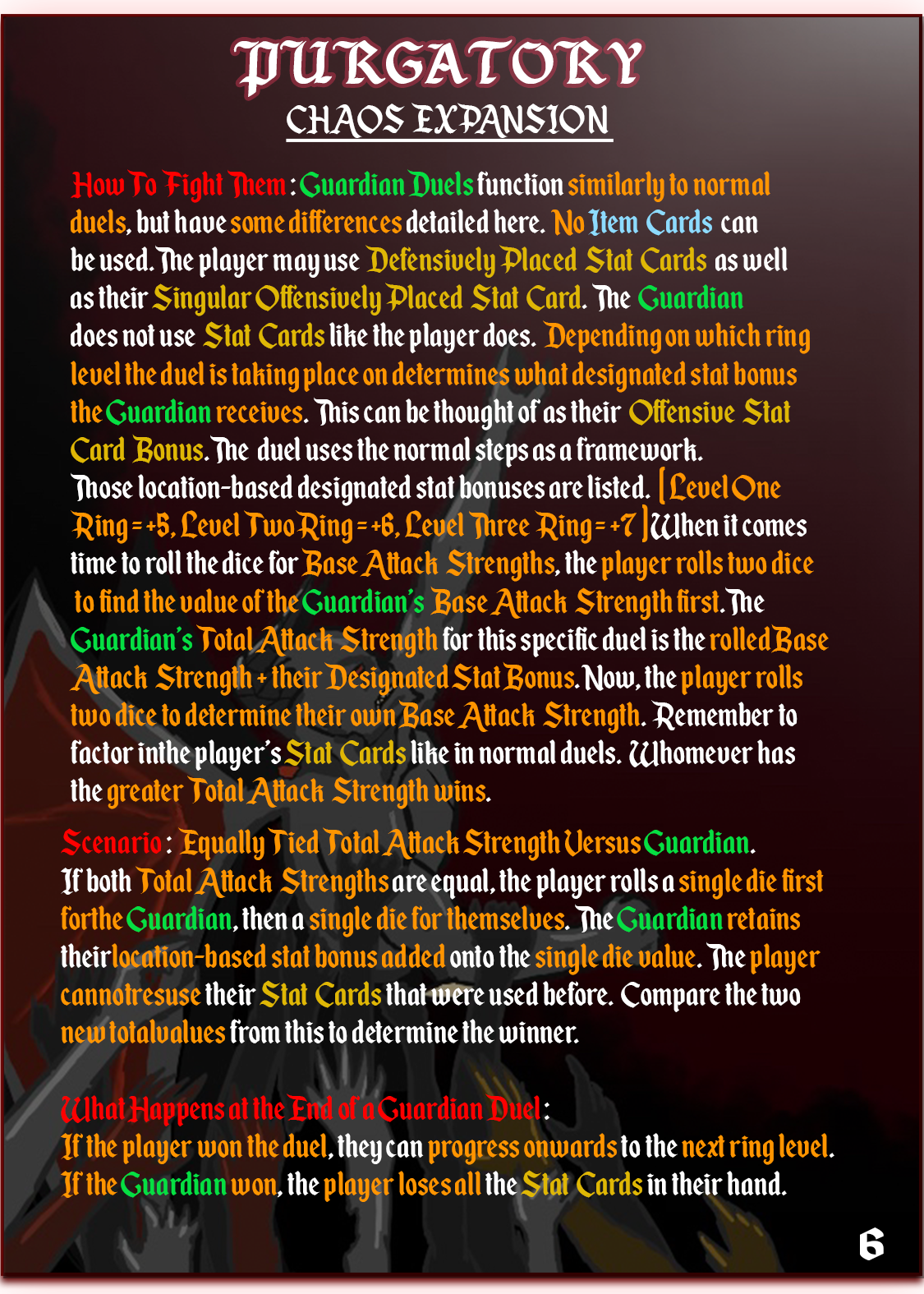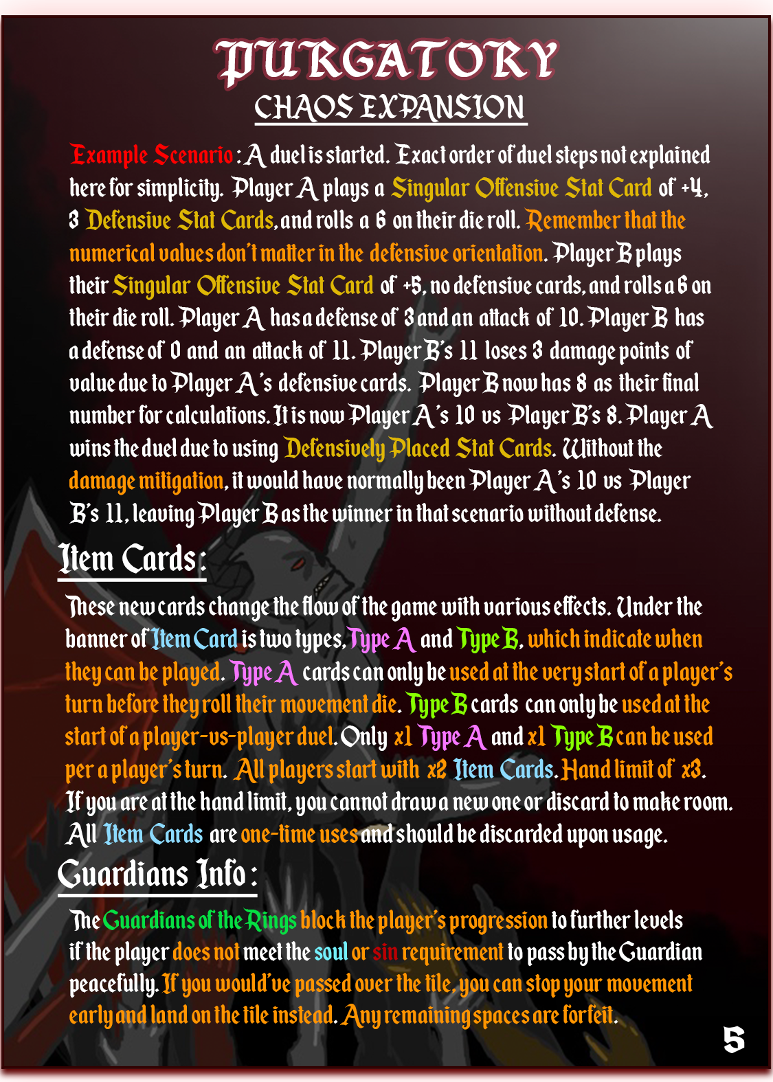 “Concept Pitch: In order to spice up the gameplay of Purgatory and make it more unpredictable and chaotic (pun intended), we’ve added new card types to make the gameplay, especially duels, more varied. The Chaos Version of the game allows the usage of these new cards as well as adding new mechanics such as the option to play Stat Cards defensively in a duel and using the Teleport Tile to challenge a Guardian for a price. We’ve also made sweeping balancing changes to the original game by reducing the number of sins required to move between rings, changing the balance of Guardian Duels, changing the steps of Duels to make them smoother and easier to understand, rephrasing of rules for more clarity, and more.”