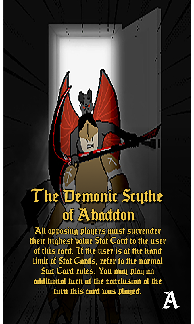 Shown above are some of the Chaos Expansion Pack’s “Item Cards”, which changed the flow of the game with their various effects, often scaling in power based on a color-rarity system. Under the banner of the single Item Card, there were two types (Type A & B) which indicated when they could be played. The colors of the frames correlate with how many of a given card exists in the deck, with blue being x4, purple being x2, and orange being x1. Only one Item Card may be used per duel per player. I was responsible for designing nearly every single one of the Chaos Expansion Pack’s new Item Cards. I came up with the overarching item card system that influenced combat as well as normal gameplay, all the card effects listed below the illustrations, the color-rarity system influencing the cards’ strength and quantities available, and amended my rulebook from the base game to accommodate the expansion as well as improvements to its readability.